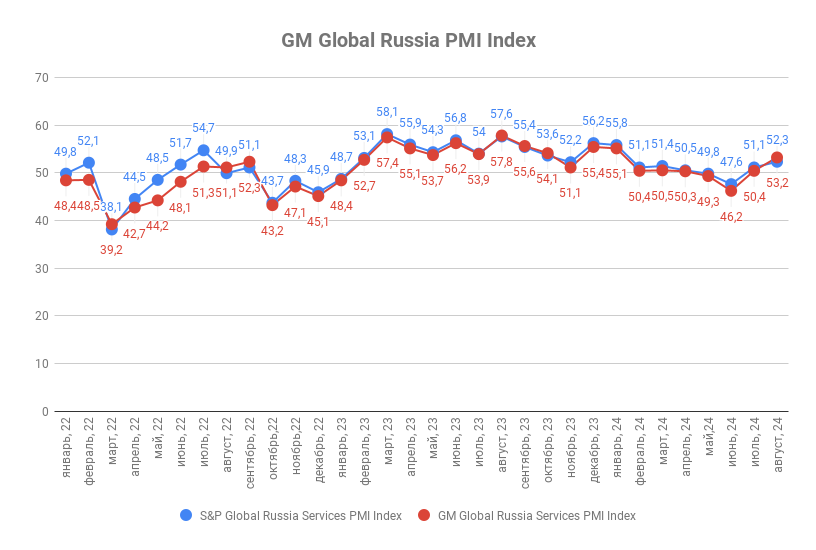 Августовское значение индекса деловой активности ГлобалМедиа PMI (GM Global Services Russia PMI Index) составило 53,2 п.п., что выше значения в июле - 50,4 п.п. Это свидетельствует о продолжающемся восстановлении экономики страны и росте активности в деловом секторе.