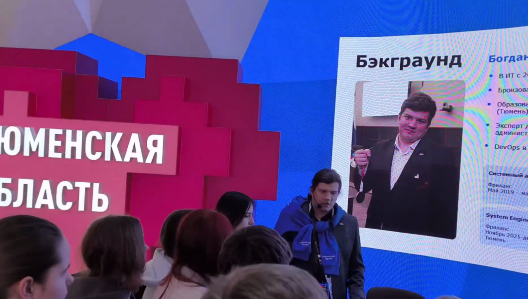 IT-специалист Богдан Ивакин рассказал о карьере школьникам на стенде Тюменской области на форуме-выставке "Россия" на ВДНХ. Сейчас он является DevOps компании РТ МИС, а в недавнем прошлом был студентом тюменского колледжа цифровых и педагогических технологий.