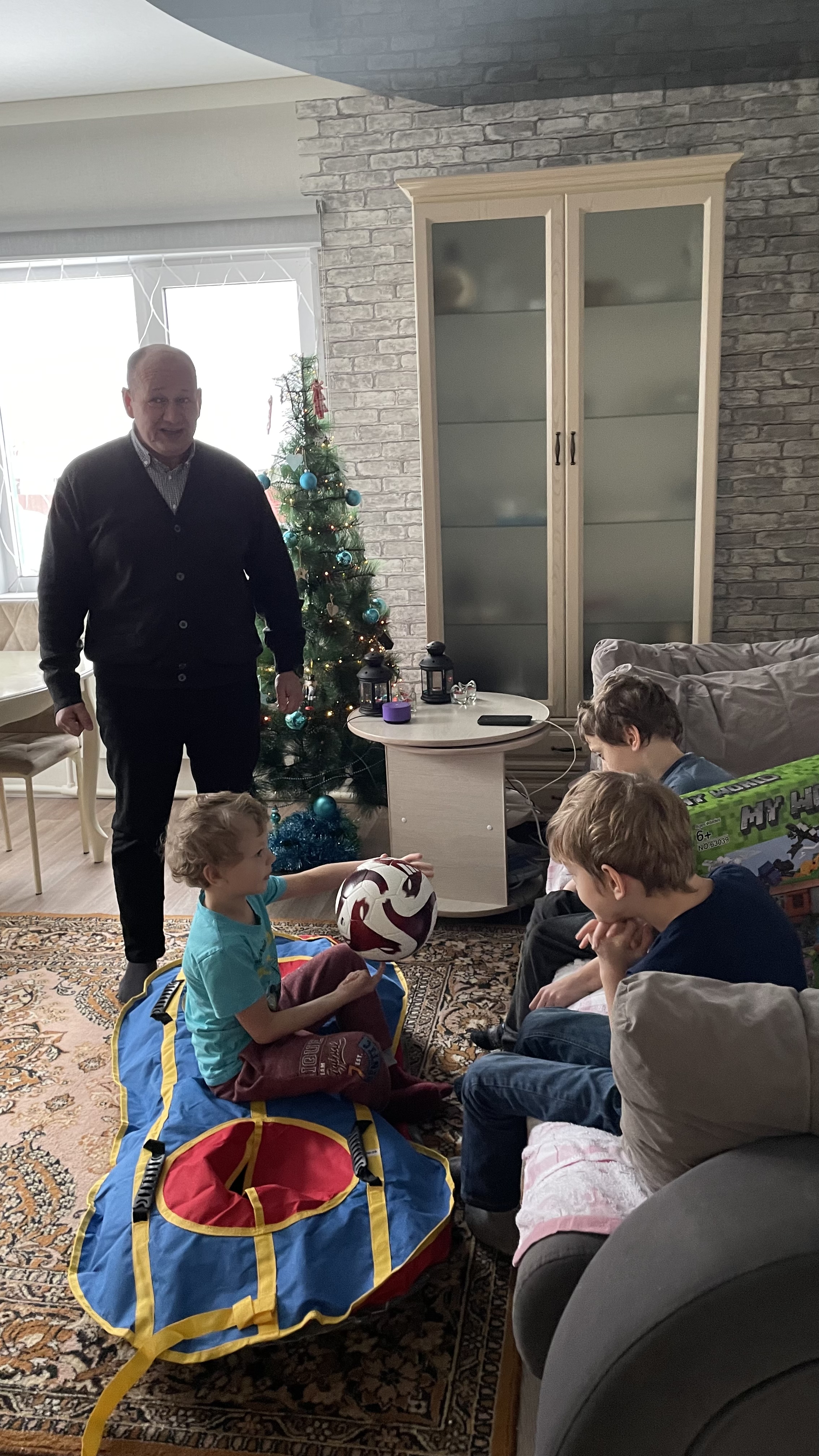 Представители Управления поздравили многодетную семью из села Каскара Тюменского района Тюменской области с Новым годом и торжественно вручили подарки, исполнив новогодние желания детей (тюбинг, конструктор «Lego» и футбольный мяч).