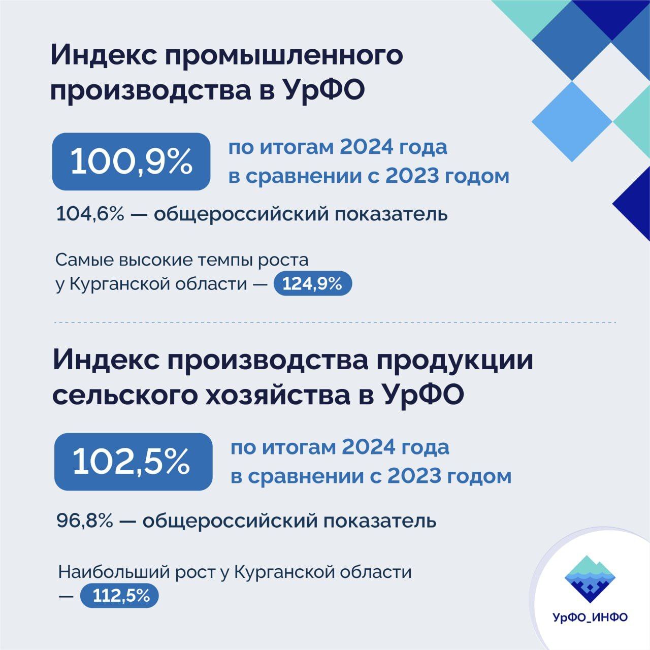 | Источник фото: t.me/urfo_info.Индекс промышленного производства в УрФО по итогам 2024 года в сравнении с 2023 годом составил 100,9%, общероссийский показатель - 104,6%. Самые высокие темпы роста продемонстрировала Курганская область - 124,9%, регион занял первое место в стране по росту индекса промышленного производства.