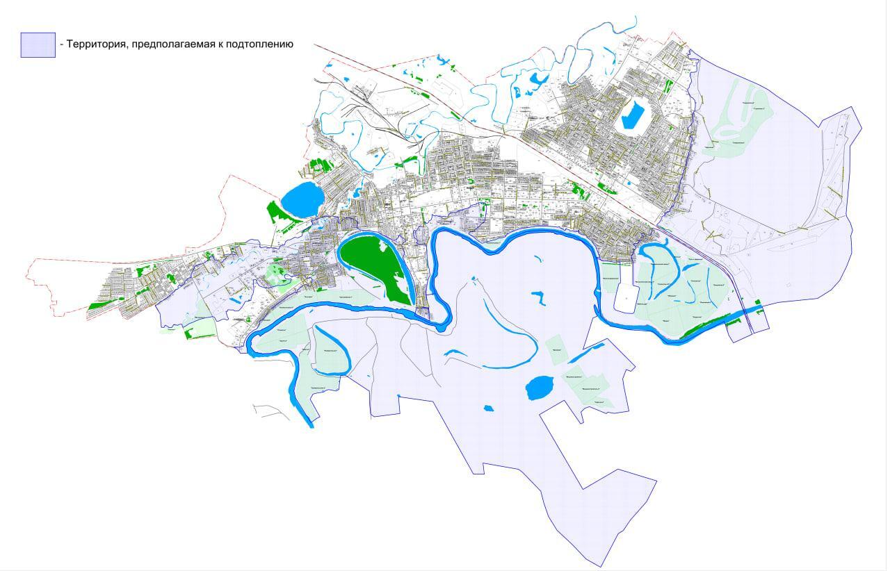 Уровень гидротехнического сооружения, защищающего город от большой воды, составляет 11,20 м. При переливе через дамбу в 1 м (подъём реки до отметки 12,20 м) подтоплению подвергнется территория, обозначенная на карте синим цветом. Это около полутора тысяч домовладений и 60 многоквартирных домов, где проживают порядка 7,5 тыс. человек, из них 1645 детей.