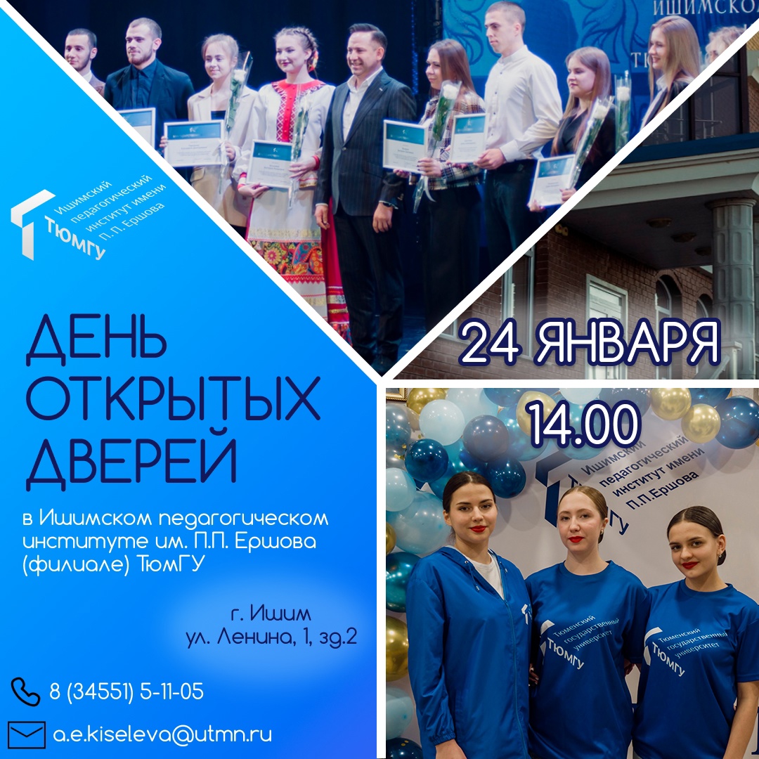 24 января Ишимский педагогический институт им. П.П. Ершова (филиал) ТюмГУ приглашает обучающихся 10-11 классов общеобразовательных учреждений, педагогов и родителей на День открытых дверей !