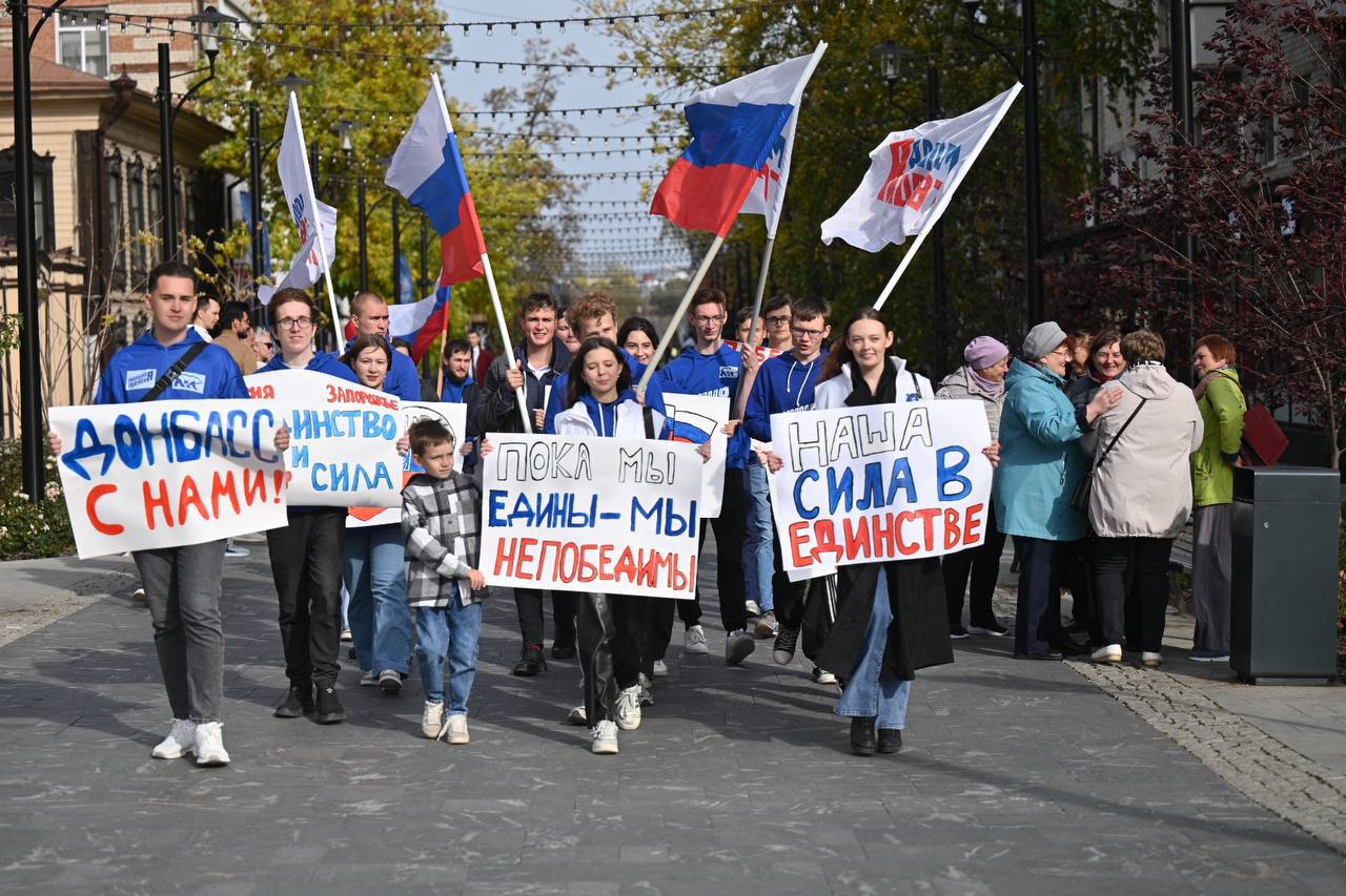 Шествие состоялось на пешеходной улице Дзержинского. Участники акции прошли с плакатами с фразами «Мы вместе», «Россия, Донбасс — навсегда!» и «С возвращением!», выражая свою поддержку жителям новых регионов.