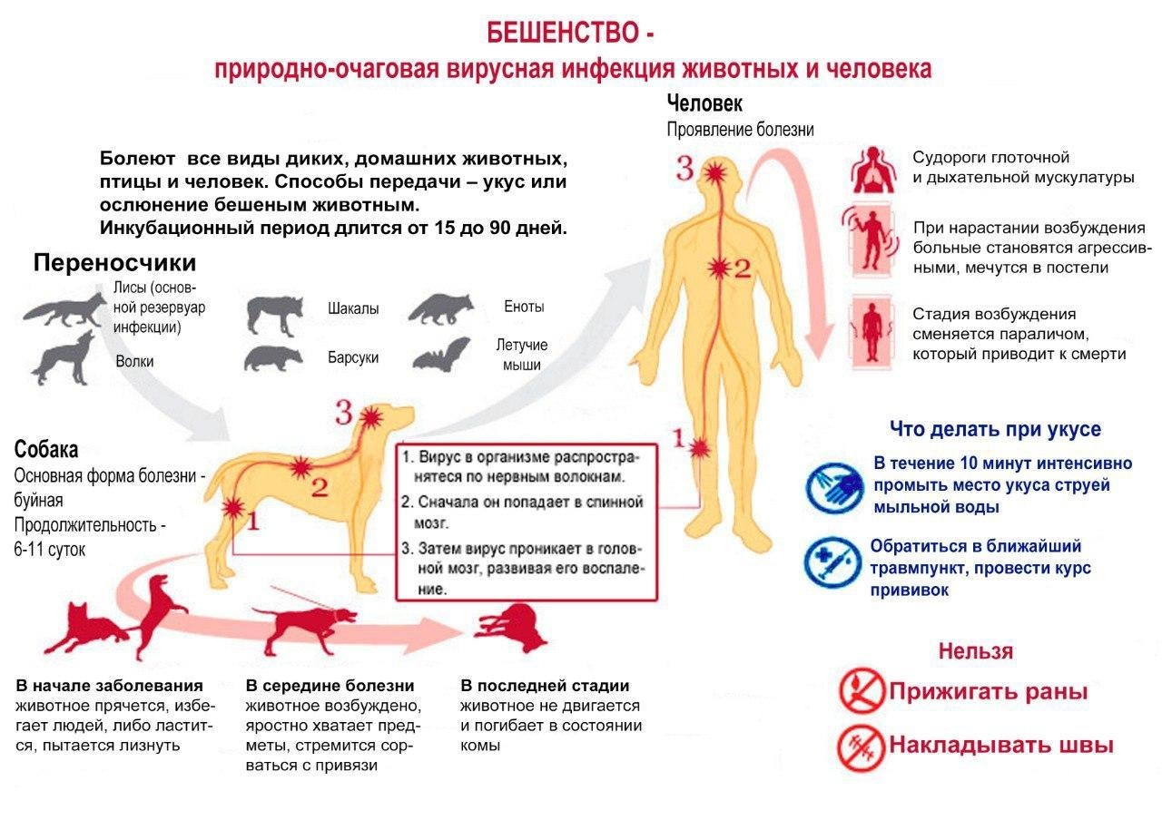 Пути заражения человека. По данным ВОЗ, в 99% случаев люди заражаются от собак. Вирус бешенства передается вместе со слюной животных. Люди заражаются, если их укусило больное животное, реже — если слюна попала в царапины, на слизистые глаз, носа или рта.