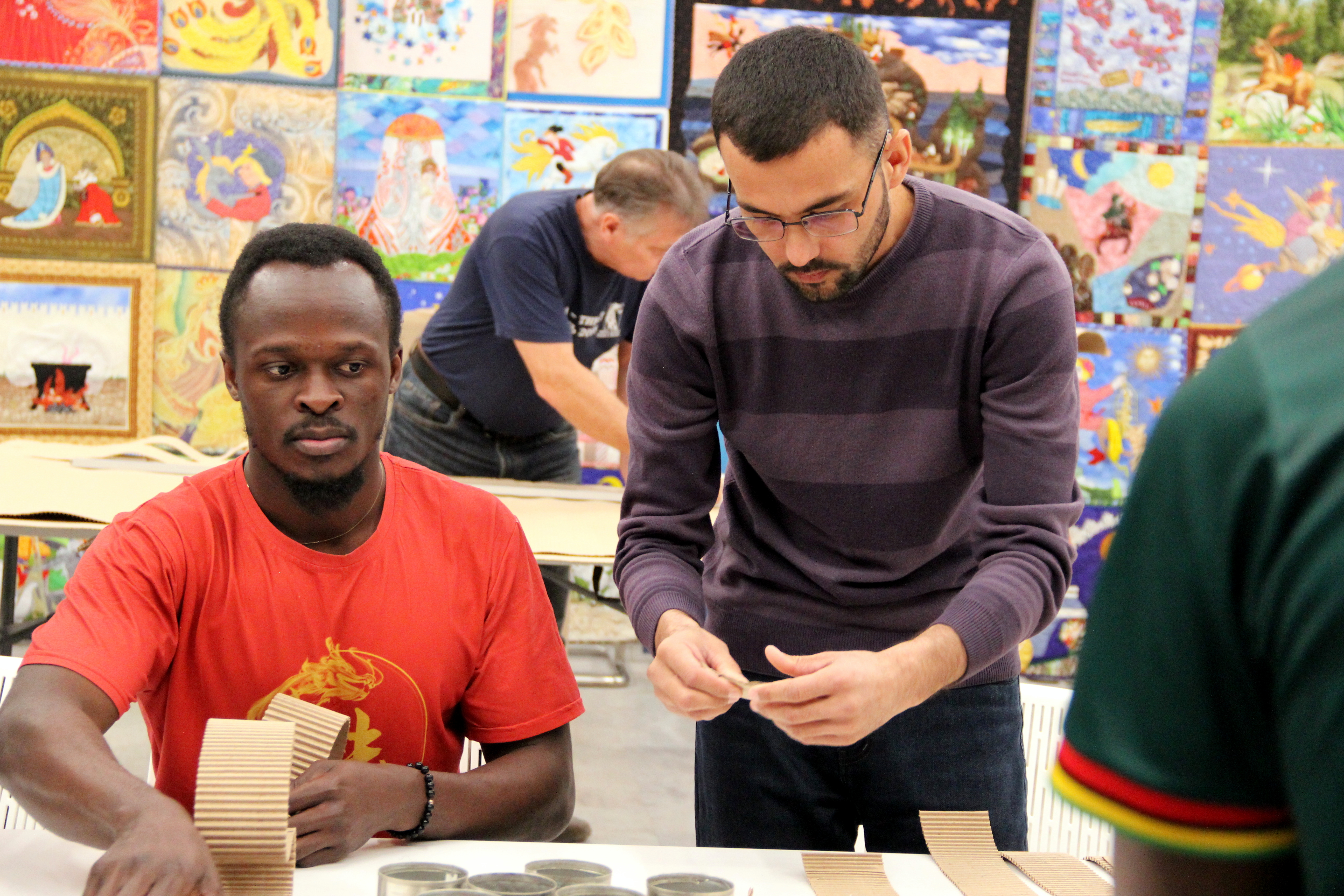Активисты без лишних слов включились в работу, девушки склонили головы над картонной лентой, сосредоточенно скручивая ее в «улитку». Парни тоже не отстают – без проблем сворачивают твердую гофру по размеру банки, затем плотно вставляют и закрепляют.