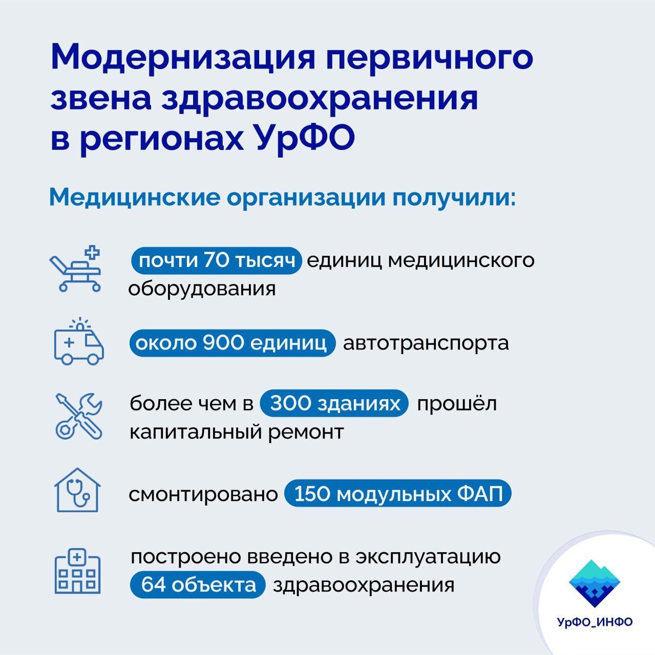 В регионах УрФО продолжается модернизация первичного звена здравоохранения. За последние три года медорганизации округа получили почти 70 тысяч единиц оборудования и около 900 единиц автотранспорта. Более чем в 300 зданиях прошел капитальный ремонт, смонтировано полторы сотни модульных ФАП, построено и введено в эксплуатацию 64 объекта здравоохранения.